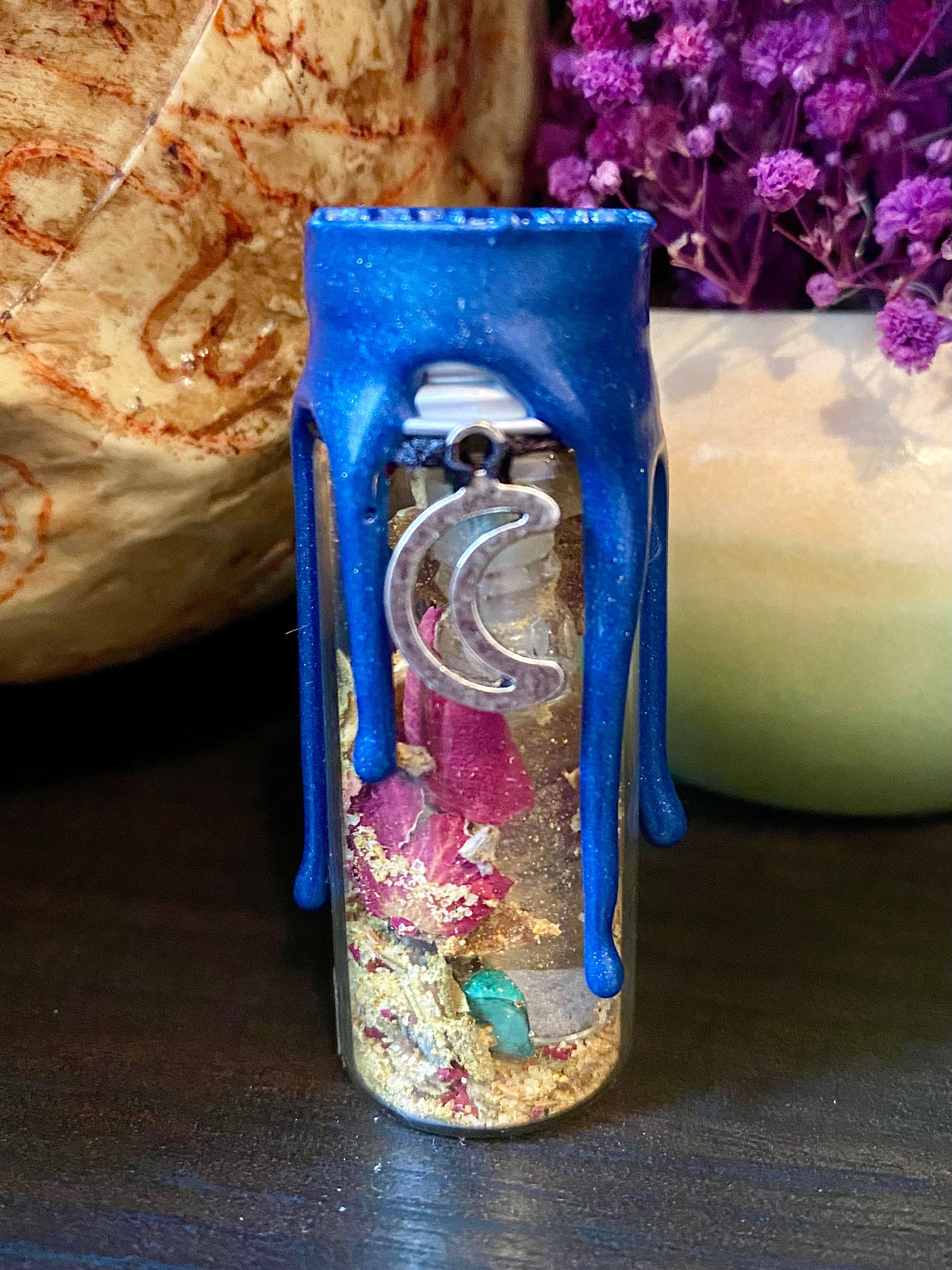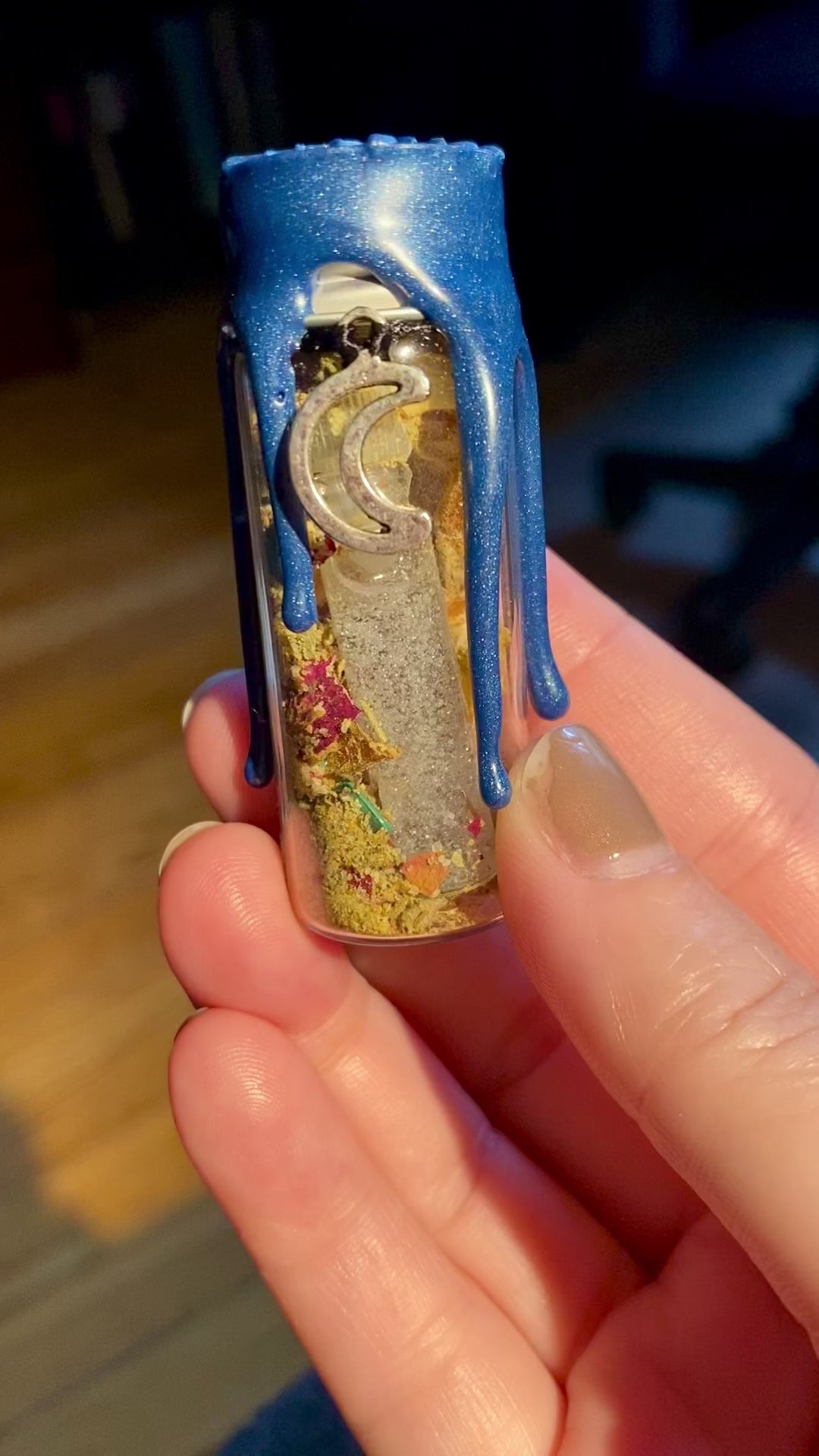 Contents: orange peel (uplifting), lavender (happiness/relaxation), rose petals (self-love), salt (protection), moon water vial (heal broken souls from sadness/worry/grief), bergamot essential oil (anti-anxiety), sealed with blue wax and a charm (charm may vary)
