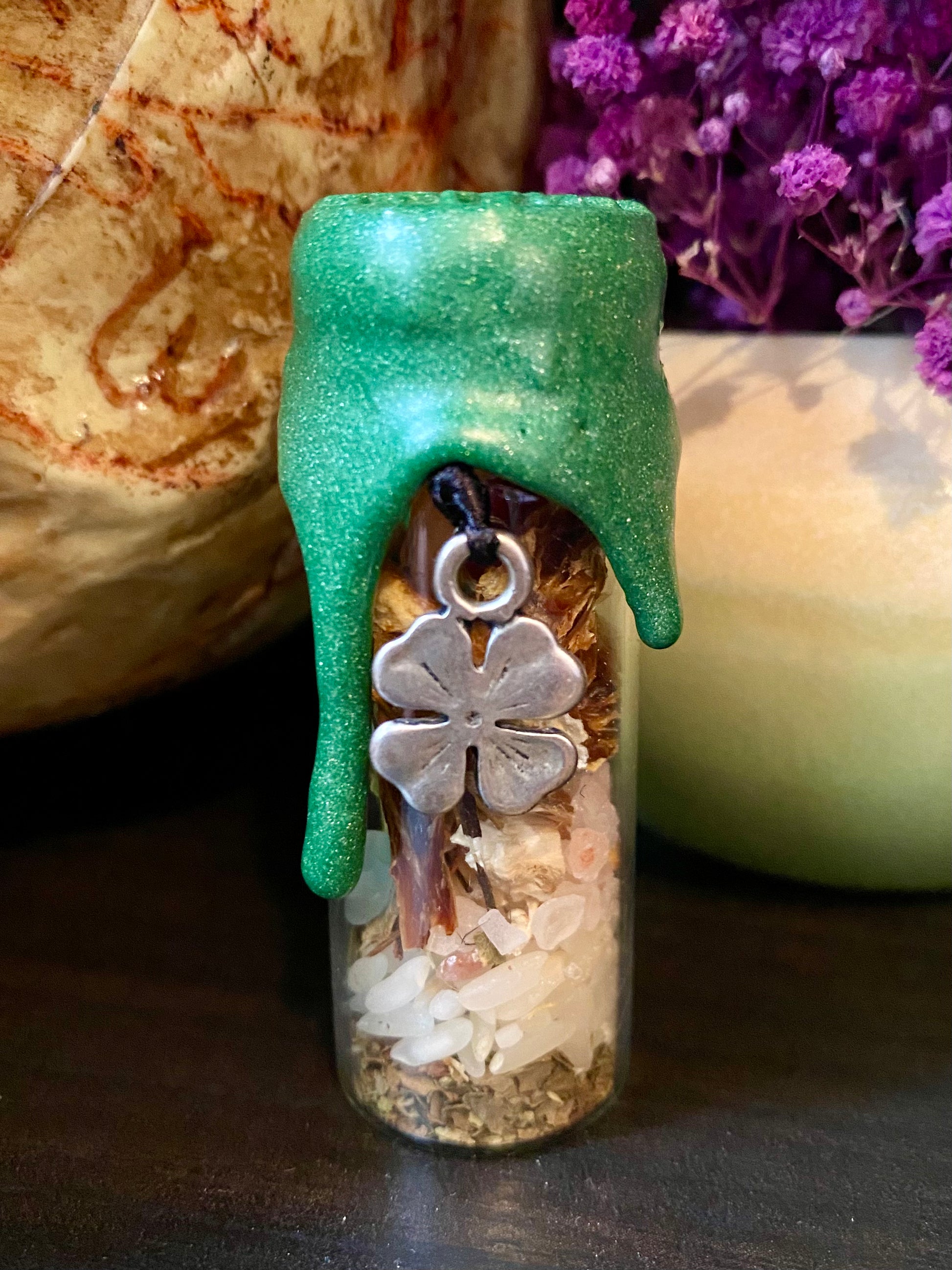 This Good Luck Spell Jar is your pocket-sized key to harnessing positive strength, good fortune and protection from bad luck. Useful as an extra boost when trying to pass that exam or simple have a great day!