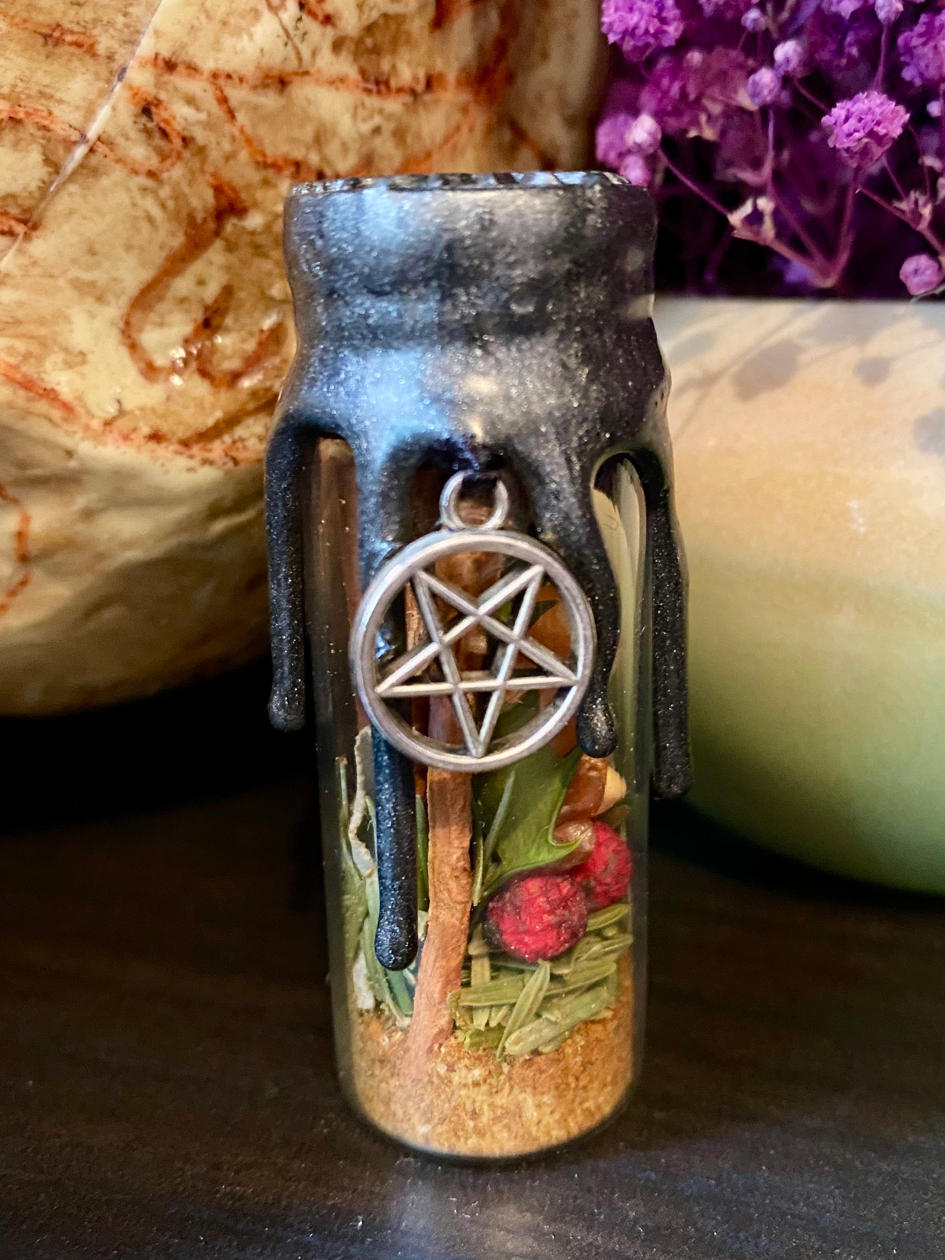 Contents: salt (protection), cinnamon (shielding), paprika (break hex), pine needles (cleanse negativity), holly & berries (protection), black feather (protection), white sage (cleanse/protect), garlic (healing), Baltic amber (protection/immunity), bergamot essential oil (protection), fire agate crystal (shielding), sealed with black wax and a charm (charm may vary)